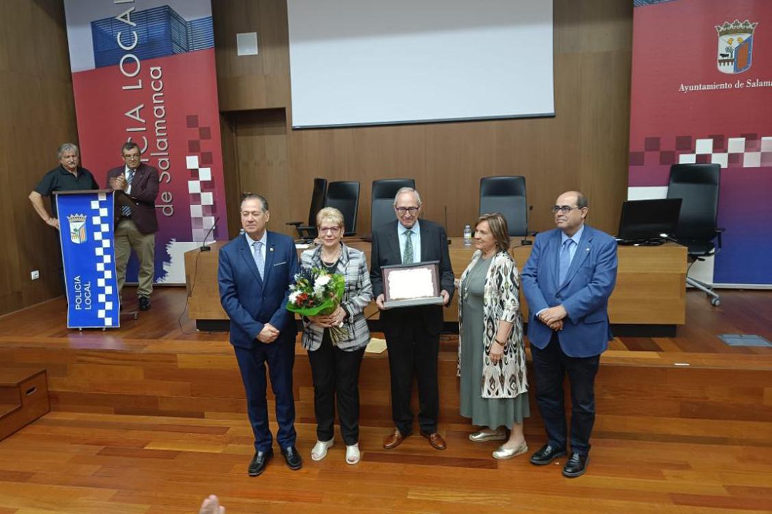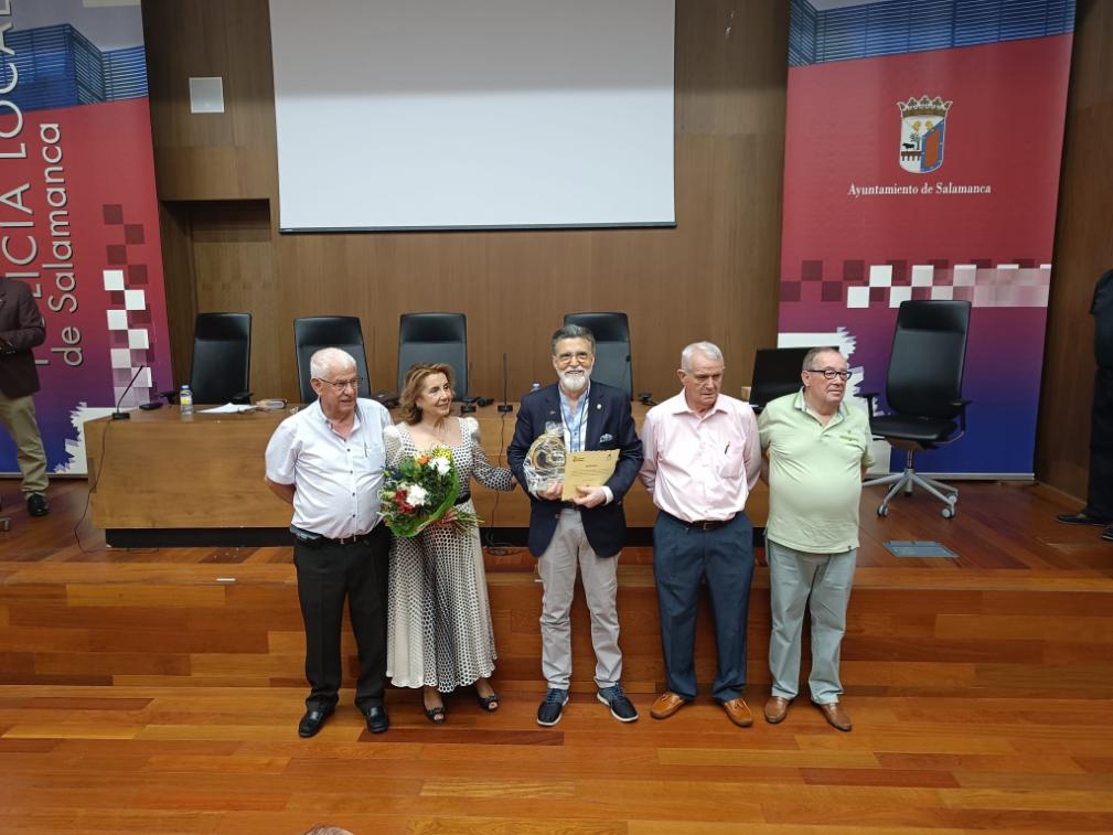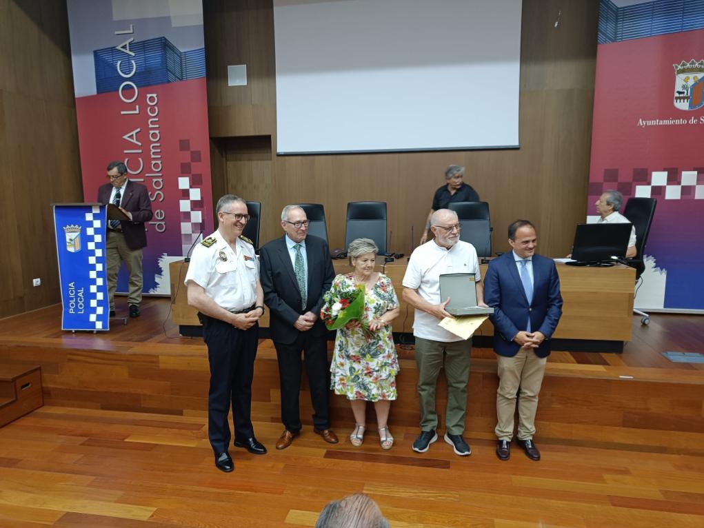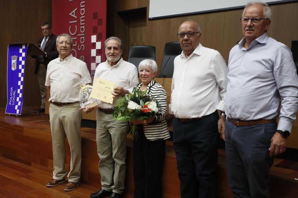 Comenzó el acto dando la bienvenida el nuevo presidente de la asociación, D. Argimiro Pérez, haciendo mención a los motivos por los que se han producido los cambios en la junta directiva, agradeciendo la labor que han desempeñado todos los que la conformaban y recordando a los socios y amigos que ya no se encuentran entre nosotros. A continuación ha pasado la palabra al nuevo secretario de la asociación D. Juan Fco. Muñoz para que diera lectura del acta de la reunión en la que fueron aprobados los homenajes en este acto. Una vez se hace entrega de las placas al socio de mayor edad y a los matrimonios que habían celebrado las bodas de oro y antes de proceder a la entrega de la placa y a el nombramiento de Presidente Fundador Honorífico, el actual presidente dirige unas emotivas palabras tanto al anterior presidente D. Jesús Sánchez Rodríguez como a su esposa, para a continuación pasar la palabra a quien fue el jefe de la policía local de Salamanca D. Jose luis Serrano Paule quien se dirige a todos los asistentes para desgranar la gran trayectoria tanto profesional como personal de D. Jesús Sánchez. Una vez finalizada la entrega de placa, diploma y ramo de flores, D. Jesús Sánchez, se dirige a todos los asistentes haciendo un breve recorrido por la historia de la asociación y recordando a los que junto a él trabajaron para su creación. Finalizados los actos de entrega de reconocimientos, el presidente invita a todos los asistentes a pasar a la zona de la cafetería para degustar un vino español.