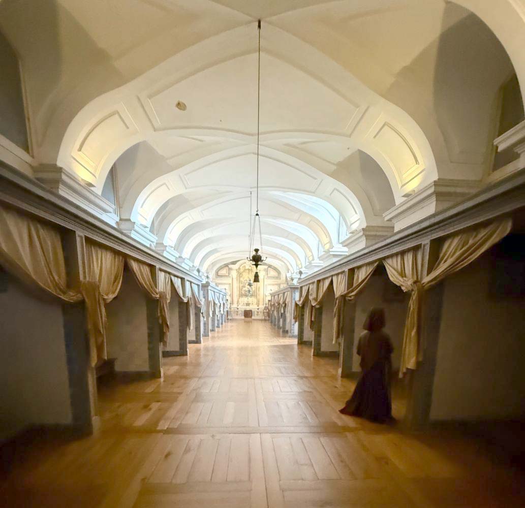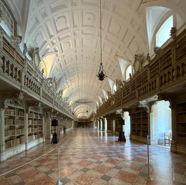 Pero vamos a la historia de este palacio: construido por el rey Juan V como consecuencia de la promesa realizada a su mujer, la archiduquesa María Ana de Austria, con la que se comprometía a construir un monasterio si le daba descendientes. El nacimiento de la princesa Bárbara de Braganza, después mujer del rey Fernando VI de España, hizo que el rey iniciara las obras. El palacio fue construido a través de seis ejes simétricos, dos torres y una basílica central. El monasterio incluye una notable biblioteca con un fondo de 30.000 libros raros.