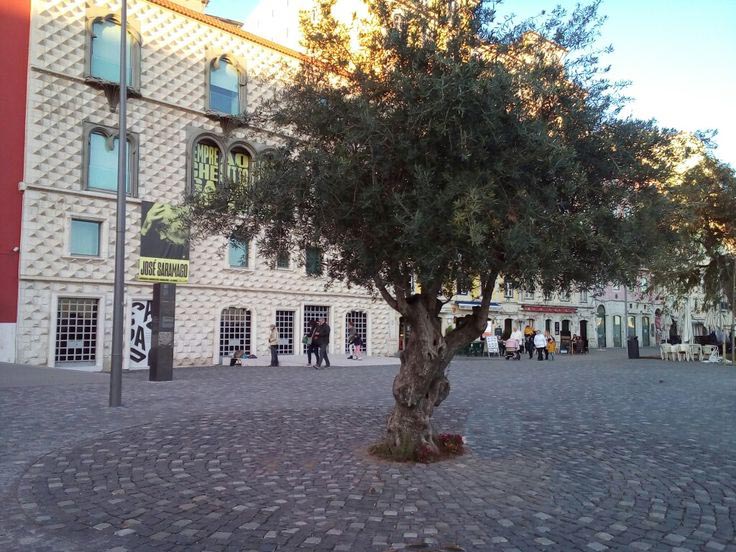 Cuando nos dirigíamos a la plaza del comercio, nos detenemos frente a un curioso edificio que es la «Casa dos Bicos» y que es donde se encuentra la fundación «Saramago». Frente a este edificio hay un olivo traído de Azinhaga, tierra natal del escritor, y bajo el que se encuentran sus cenizas.